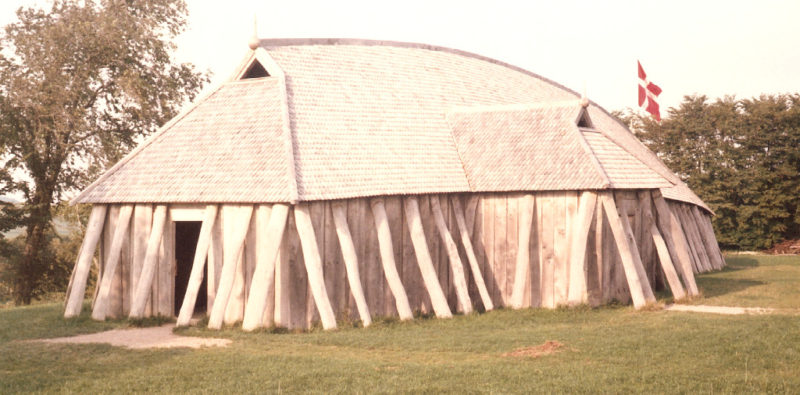 The warden advised me to visit an ancient Viking site, Fyrkat, about five kilometres away. Tired though I was, I did, and found it very interesting. On a hill overlooking a river a circular earth—works had been raised, wherein had been a Viking settlement. Alongside stood a modern replica of a huge Viking house, made entirely of timber. Nearby was a beautiful old farmstead and water-mill. I was pleased indeed that I had made the effort to see these things for they made a vivid impression on me.