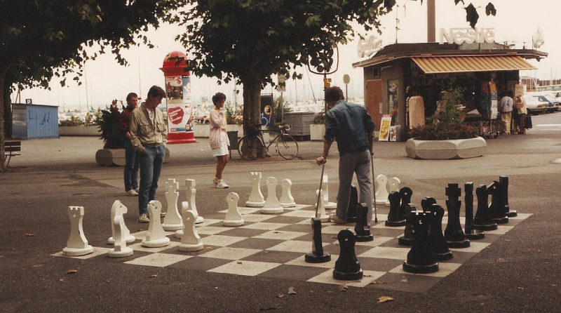 Strolling through a park at the lake edge in the evening I saw two young men playing chess on a chess “board” of about six yards square, with pieces 18 inches high. The “board” was painted on a tarmac square and the pieces were moved by sliding them with the foot.