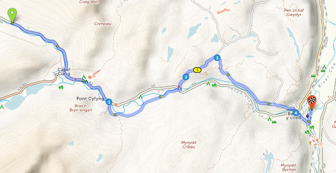 We will be visiting Betws Y Coed as a lunch stop on one of our rides, the main road to which is the A5. After the off-road section following Rt 82 there is a 6 mile stretch along the A5, to a mile south of Capel Curig. See the map below where I have marked the route options. At No 1(Pont Cyfyng – don’t ask me to pronounce it!) we cross over the river to take a nice country lane for approx 2 miles where we rejoin the A5. Here we have 2 options. See below map.